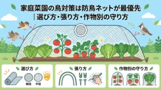 料理 家庭菜園の鳥対策は防鳥ネットが最優先|選び方・張り方・作物別の守り方 家庭菜園で鳥にフンを落とされる・葉や果実を食べられる被害に困っていませんか?農林水産省や農研機構の公的資料をもとに、防鳥ネットの網目の選び方・正しい張り方・作物別の具体的な守り方を解説します。 2026.03.26 料理